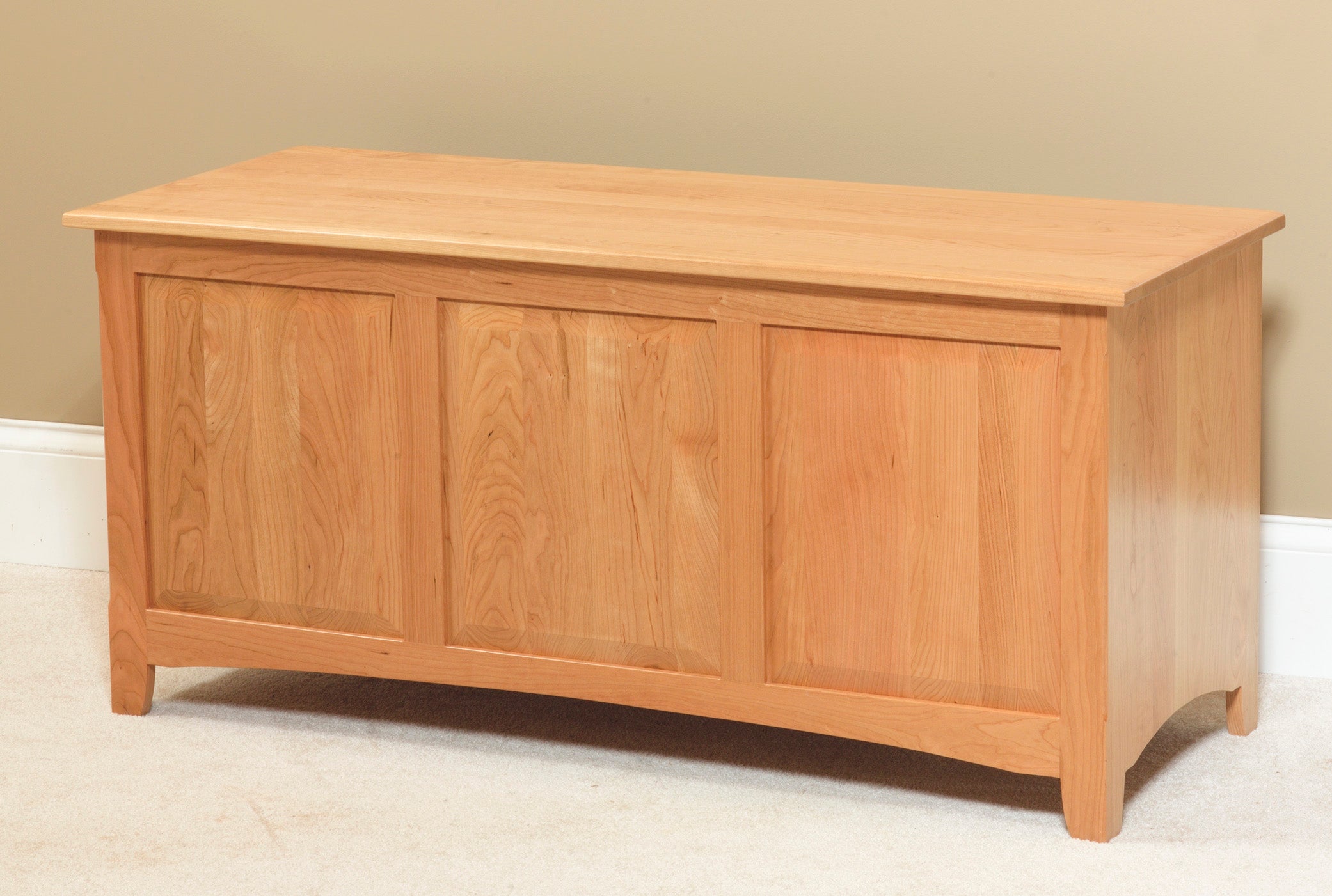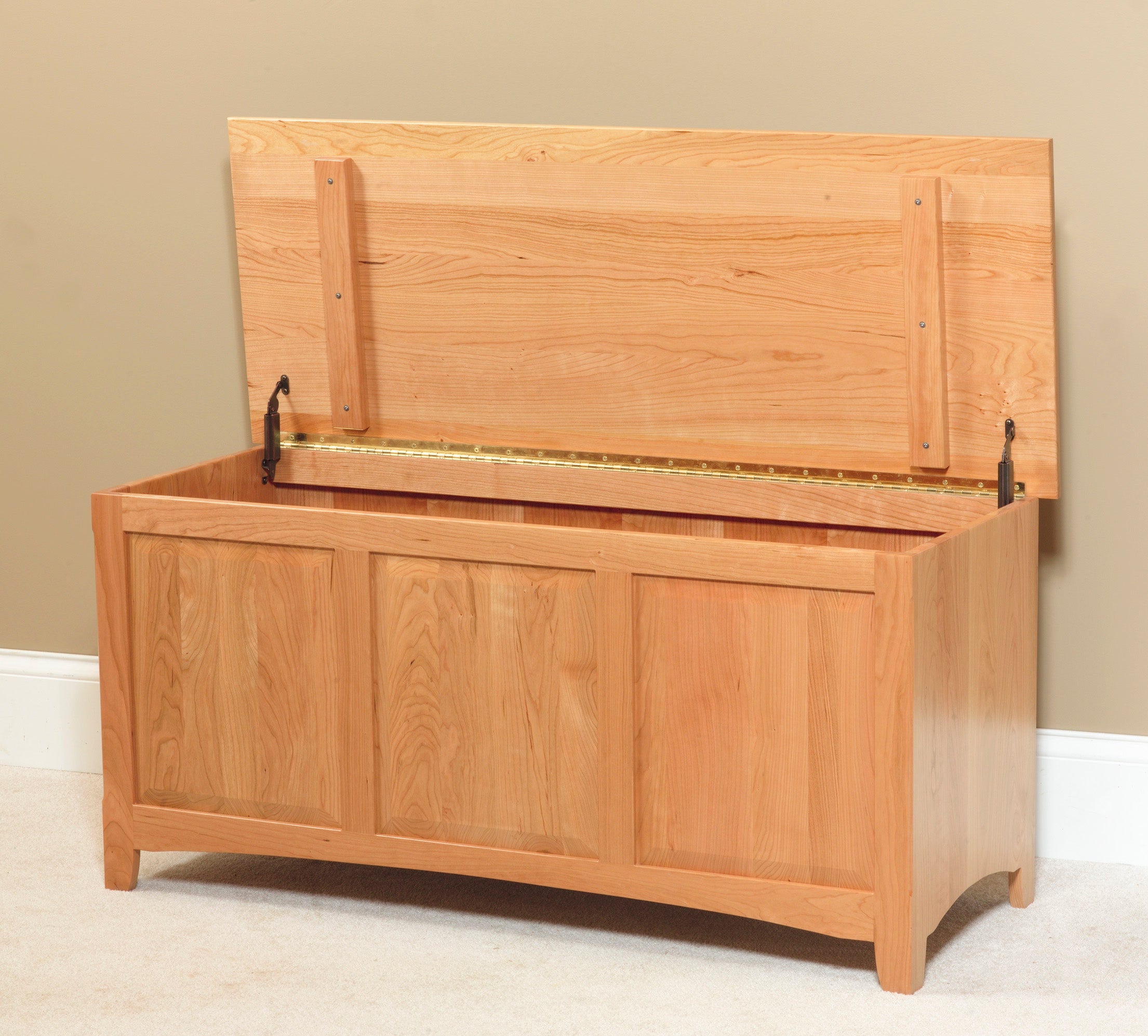 Solid hardwood blanket chest with spring loaded safety hinge. Available in solid Maple, Oak, and Cherry. Made in the USA.