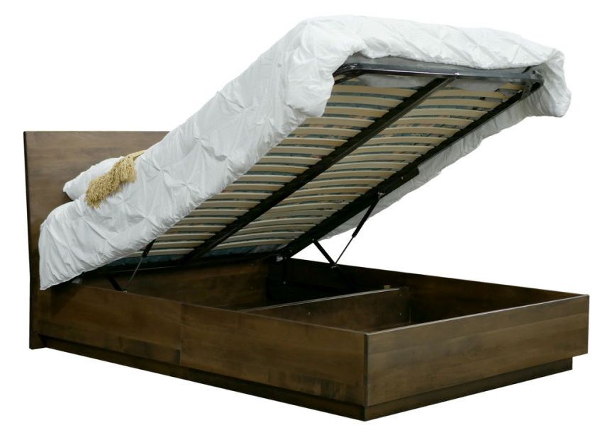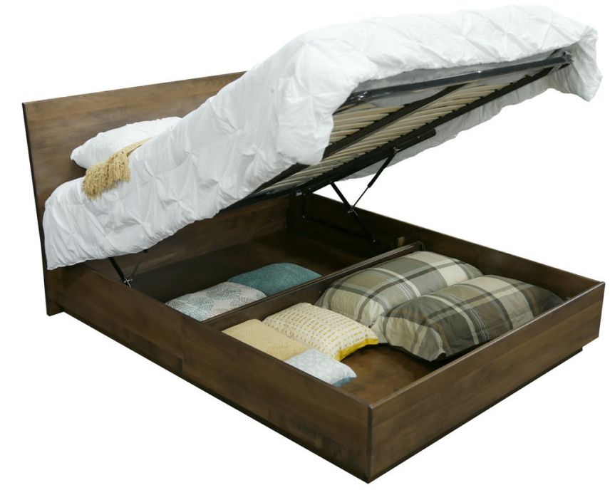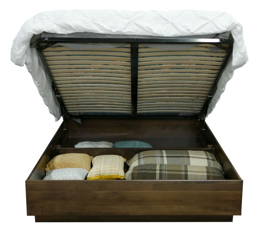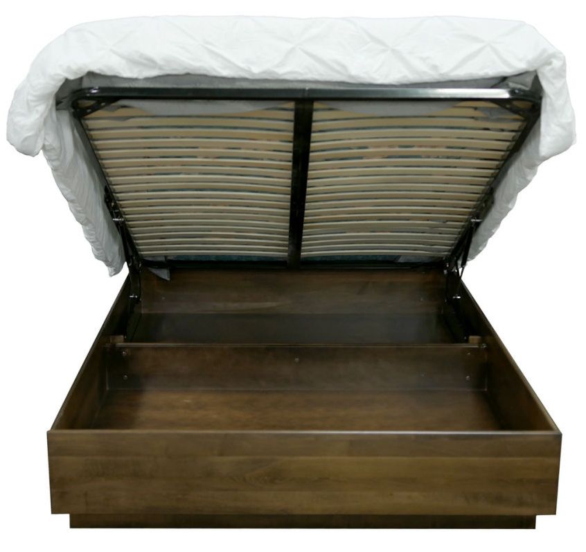 The Hudson platform lift-top storage bed with metal mattress frame is offered in solid maple, queen and king sizes only. This storage bed is available with no head board, or the solid maple headboard as shown. Note: this style base sacrifices a few inches of storage space but keeps stored items off the floor in a sealed area - ideal for seasonal clothes storage. The space sacrificed for elevating the storage area off the floor saves toes from sharp corners at the base of the bed. (Tip: Request with both storage and toe kick corners slightly eased.) Pricing based on oak or maple. Cherry and other wood pricing available on request.