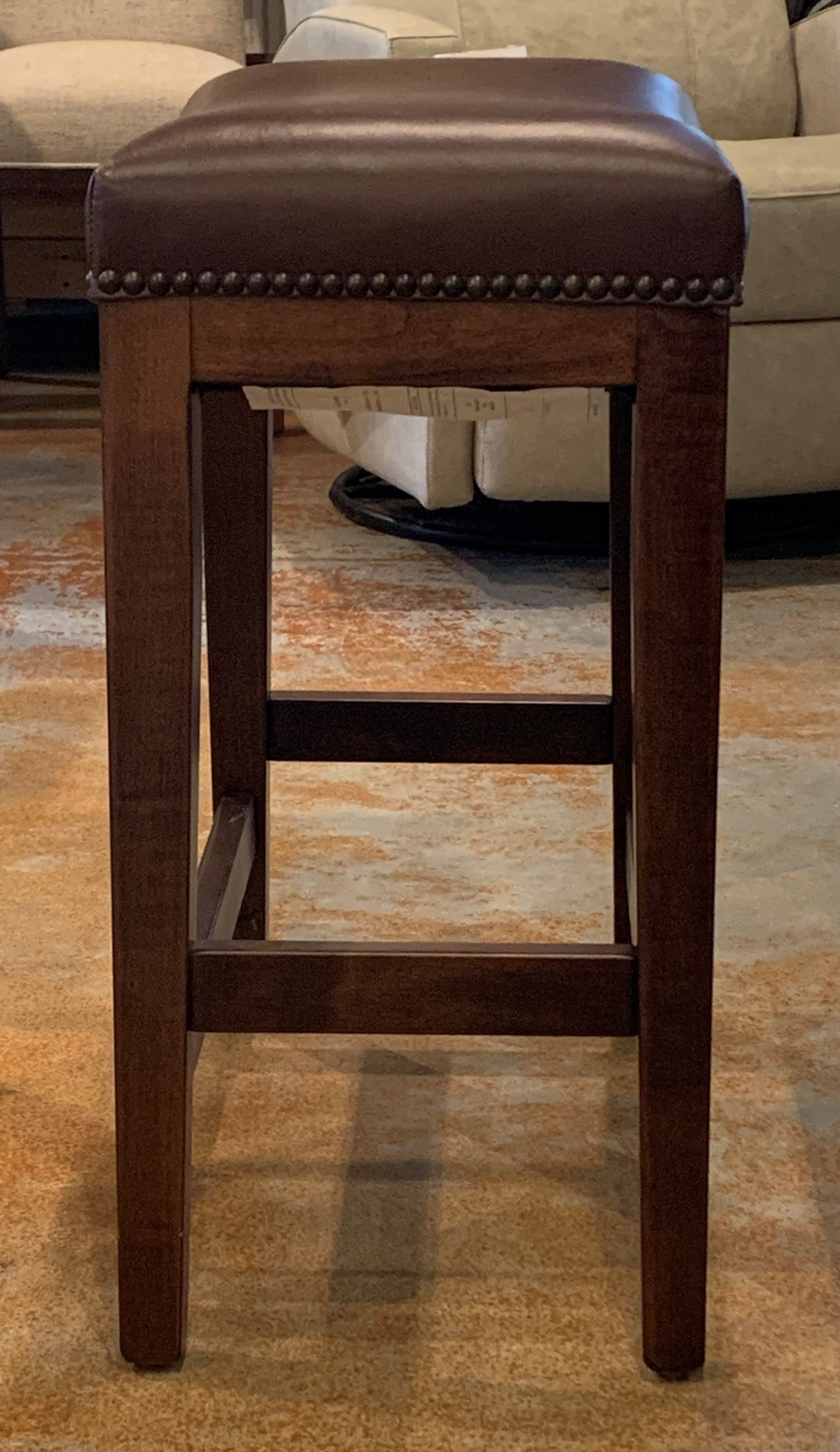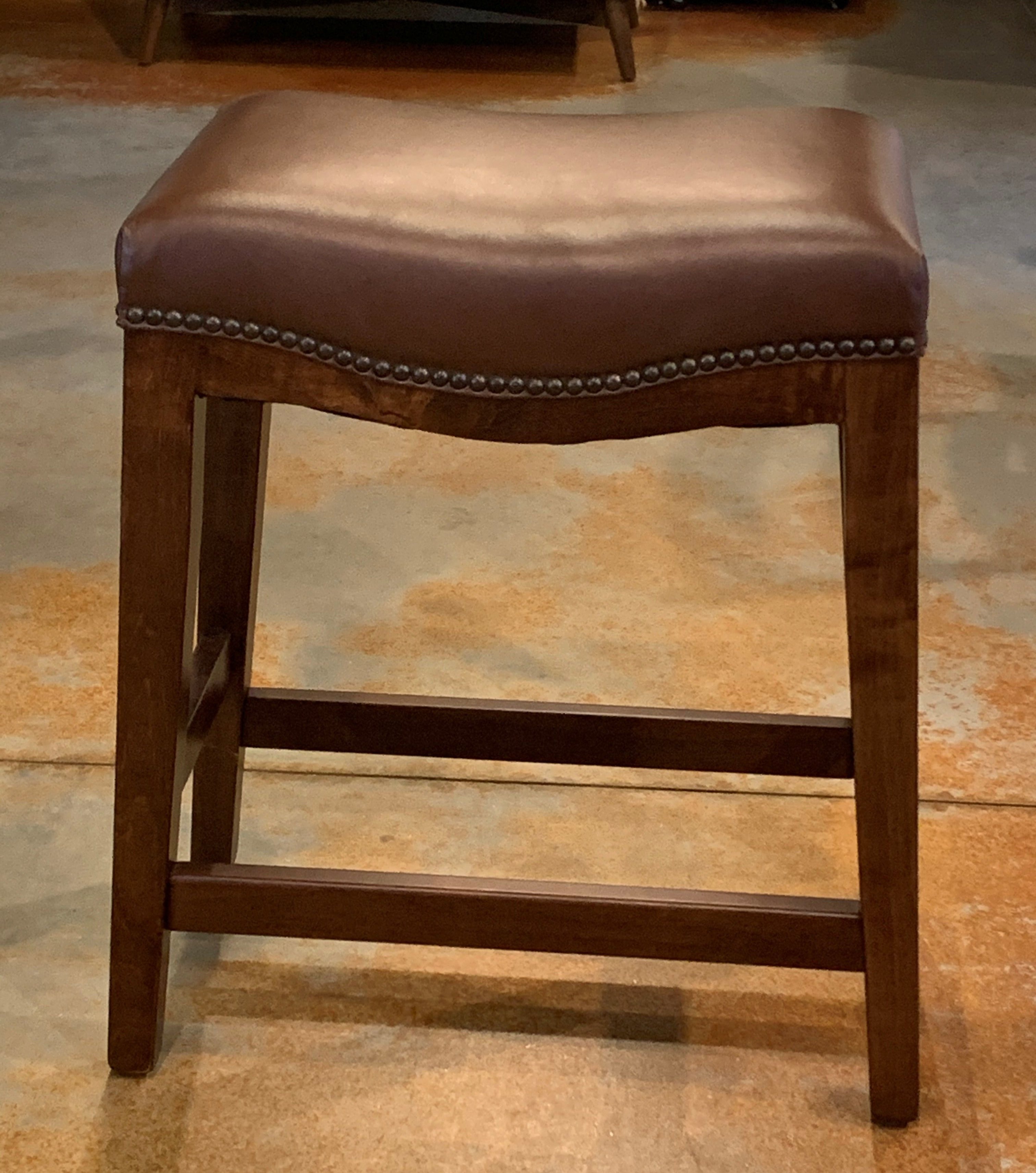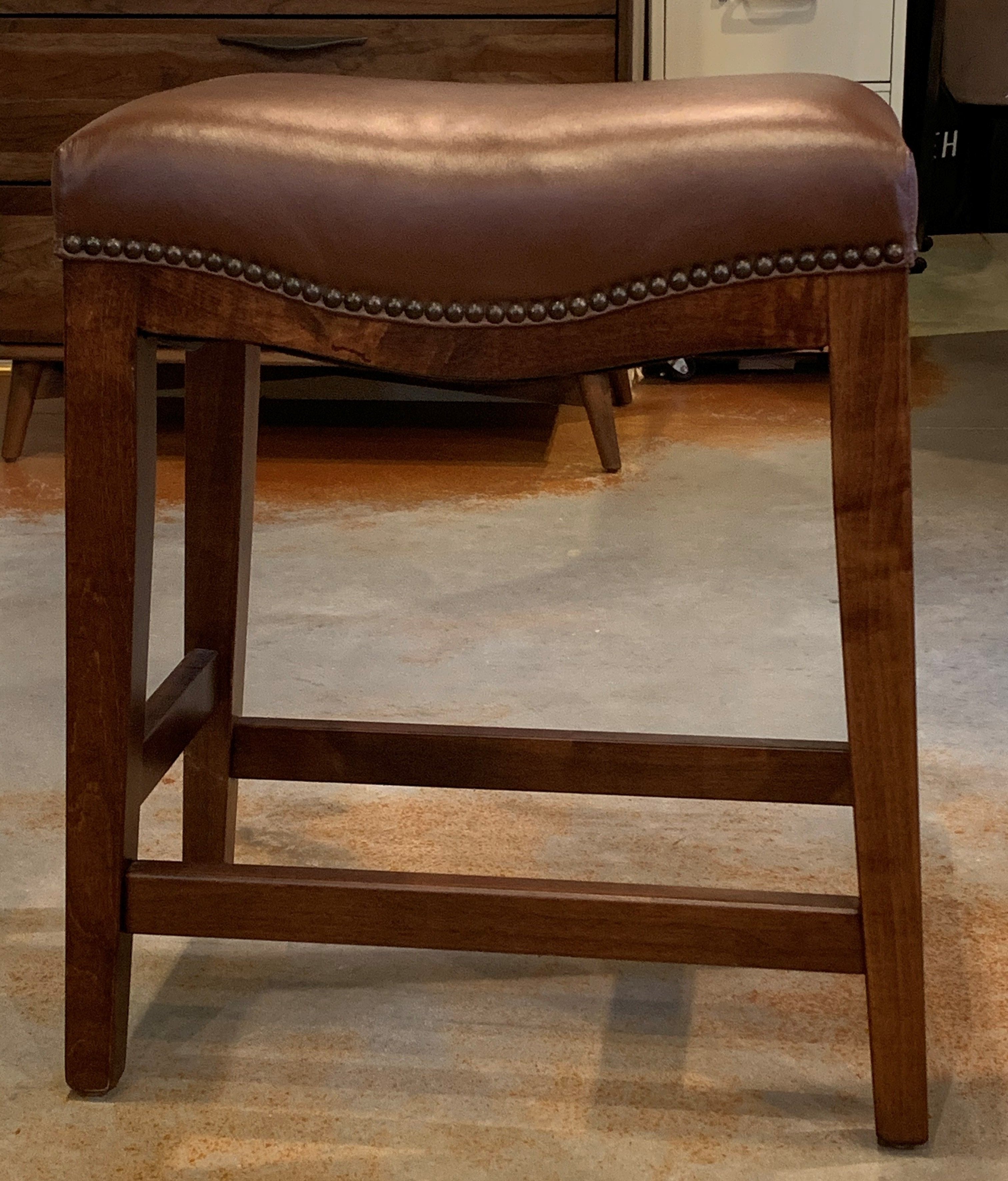 Made in USA by Ohio Amish, this single counter-height stool has a deep and plush padded seat. Top grain brown leather accented with bespoke nail heads. Solid maple frame in OCS 113, a medium brown stain.