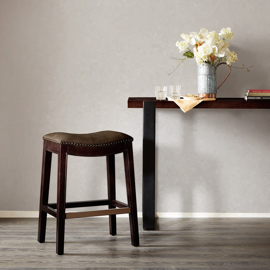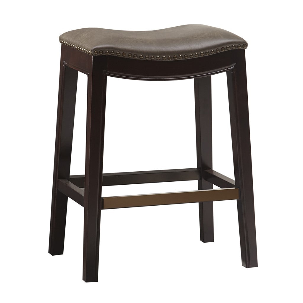 Imported. Excellent comfort and style for the value. Available in four variations of solid birch base and artificial leather or fabric top, trimmed tastefully with small nail heads. All but one variation has metal covering where you'd rest your feet, which is the first area to look scruffy on well-used stools (which these will be). Shaped and padded seat is not too soft, not too hard.