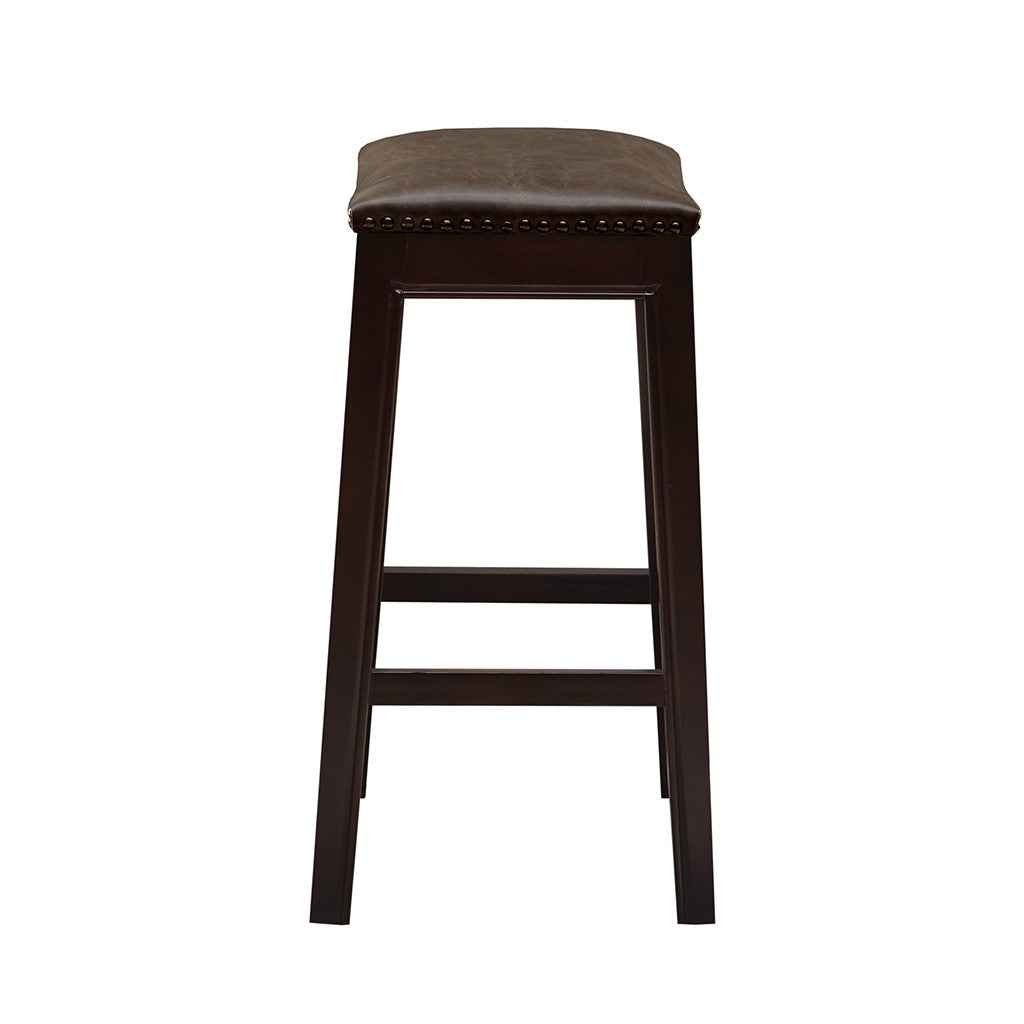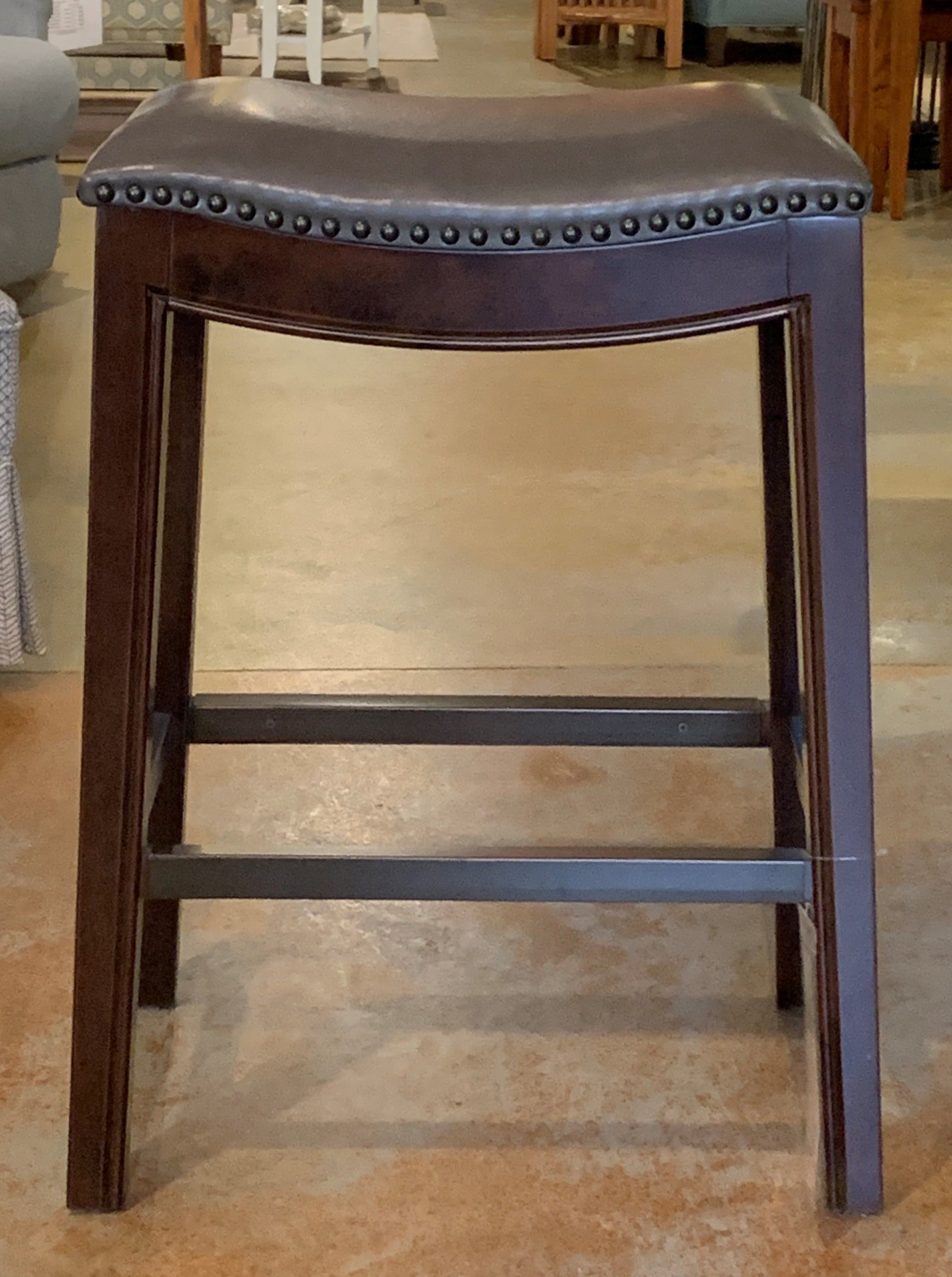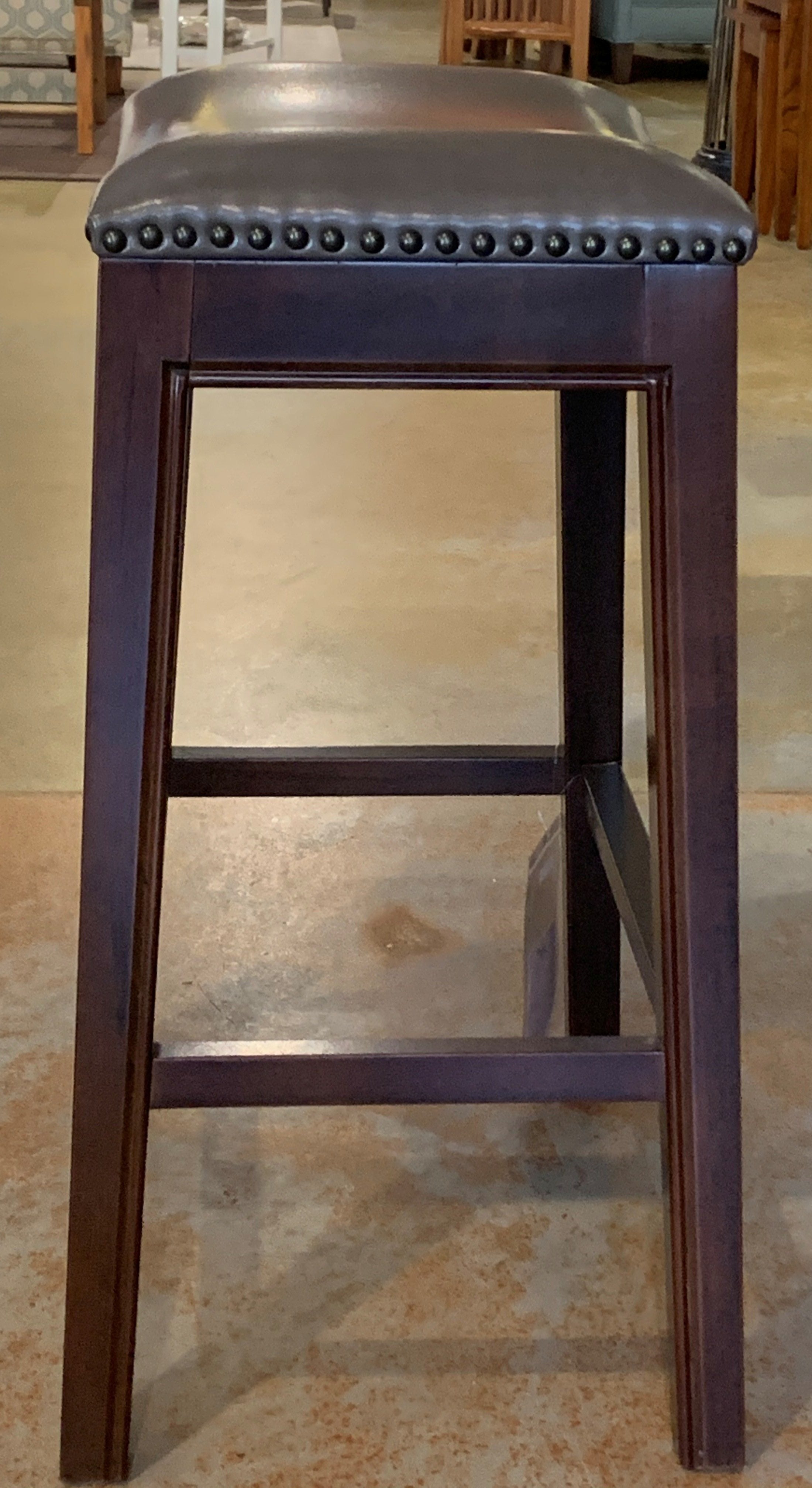 Imported. Excellent comfort and style for the value. Shown in mushroom "pleather" with nail heads. Stool foot rests have bespoke metal covering where you'd put your feet, which is the first area to look scruffy on well-used stools. Shaped and padded seat is not too soft, not too hard. Mushroom leatherette with espresso base.