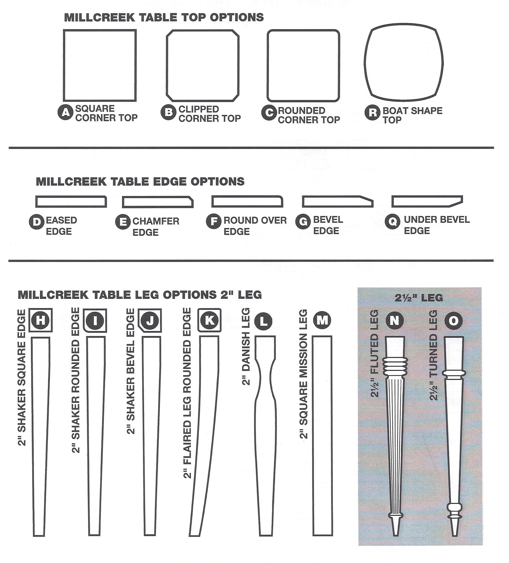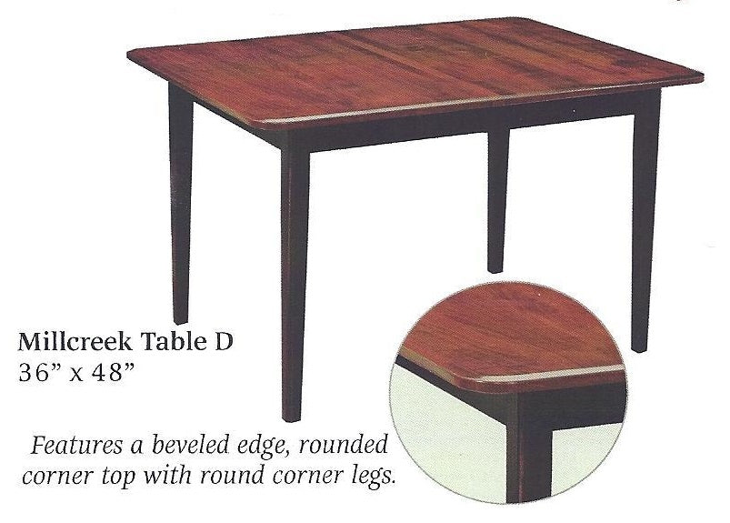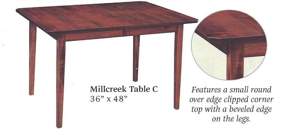 Millcreek Compact Extension Dining Table - ML3648 - At 36" wide and 48" long when closed, this well-constructed solid wood table comes with many options that make small space dining easier. This table can be made to accept one or two leaves either 12" or 18" wide. Leaves must be determined at the time of the order as the wooden extension glides and leaves are custom made for each table. Available in Maple, Cherry and Oak (click the wood species to see the finishes available. Exact finish matching to paint and older finishes is available for a fee.)