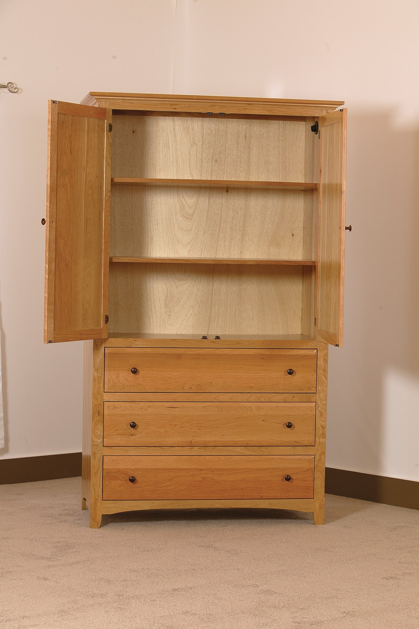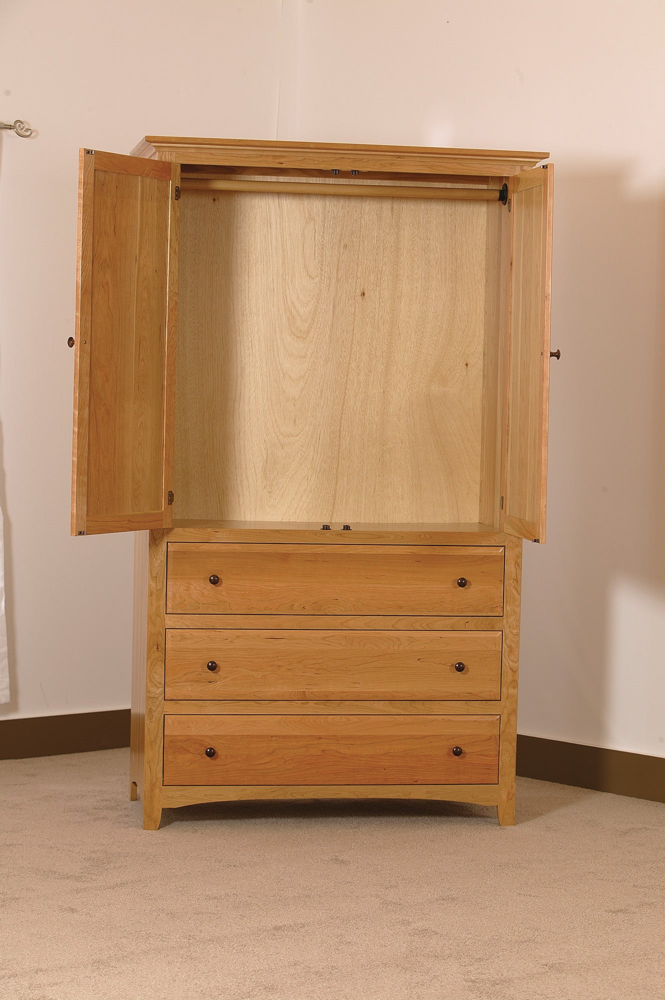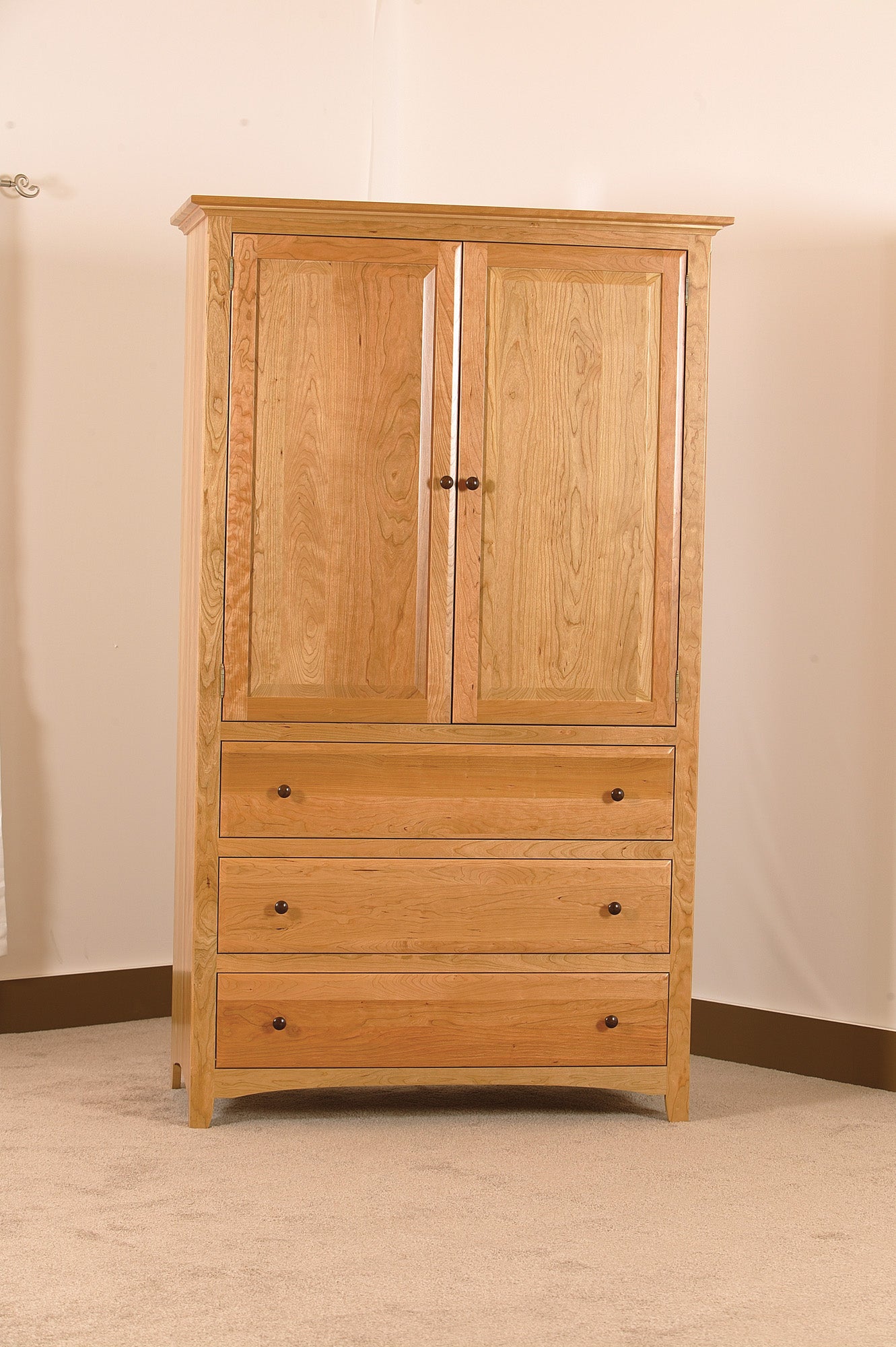 Solid hardwood wardrobe with raised panel doors, inside hang rod or shelves for clothes. Three spacious drawers. Turned Walnut knobs. Many options available. Made in the USA.
