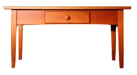 Narrow Cherry Shaker Coffee Sofa Table with Drawer - 301-C Amish made from solid cherry with natural finish (OCS 100) is ideally sized for placement with one of our smaller condo sofas. As cherry does, especially in lighter finishes, the wood will darken with exposure to sunlight. Drawers are double faced with dovetail construction with solid wood knob finished the same as the drawer face.