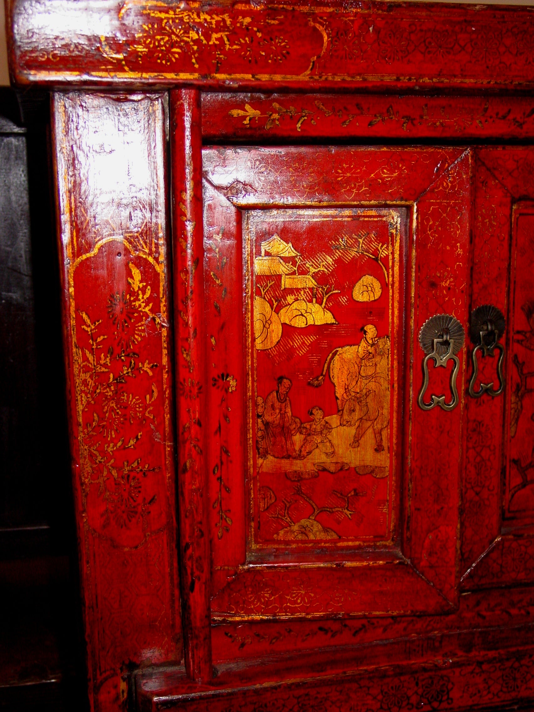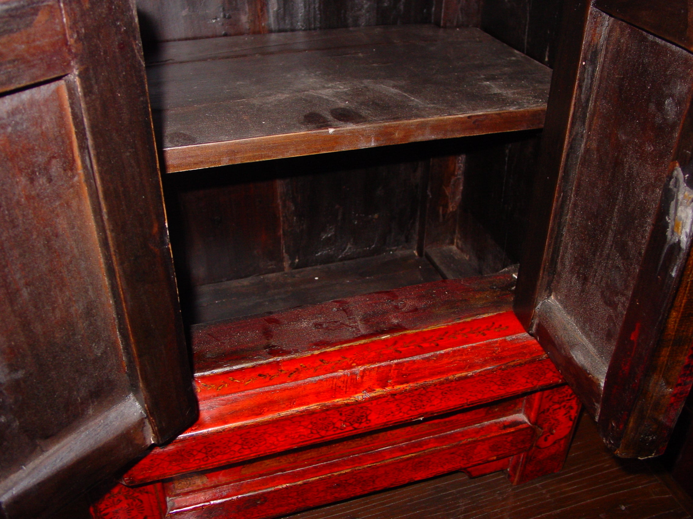Pair of antique Chinese nightstands with painted doors EFH-011 - Stunning and beautiful, solid and timeless, these matching end tables could be nightstands. These have doors that are built with hand tools, not hinged, but on posts that allow them to be removed if necessary. One table's top is loose, we are selling as is. Price is for set of 2!