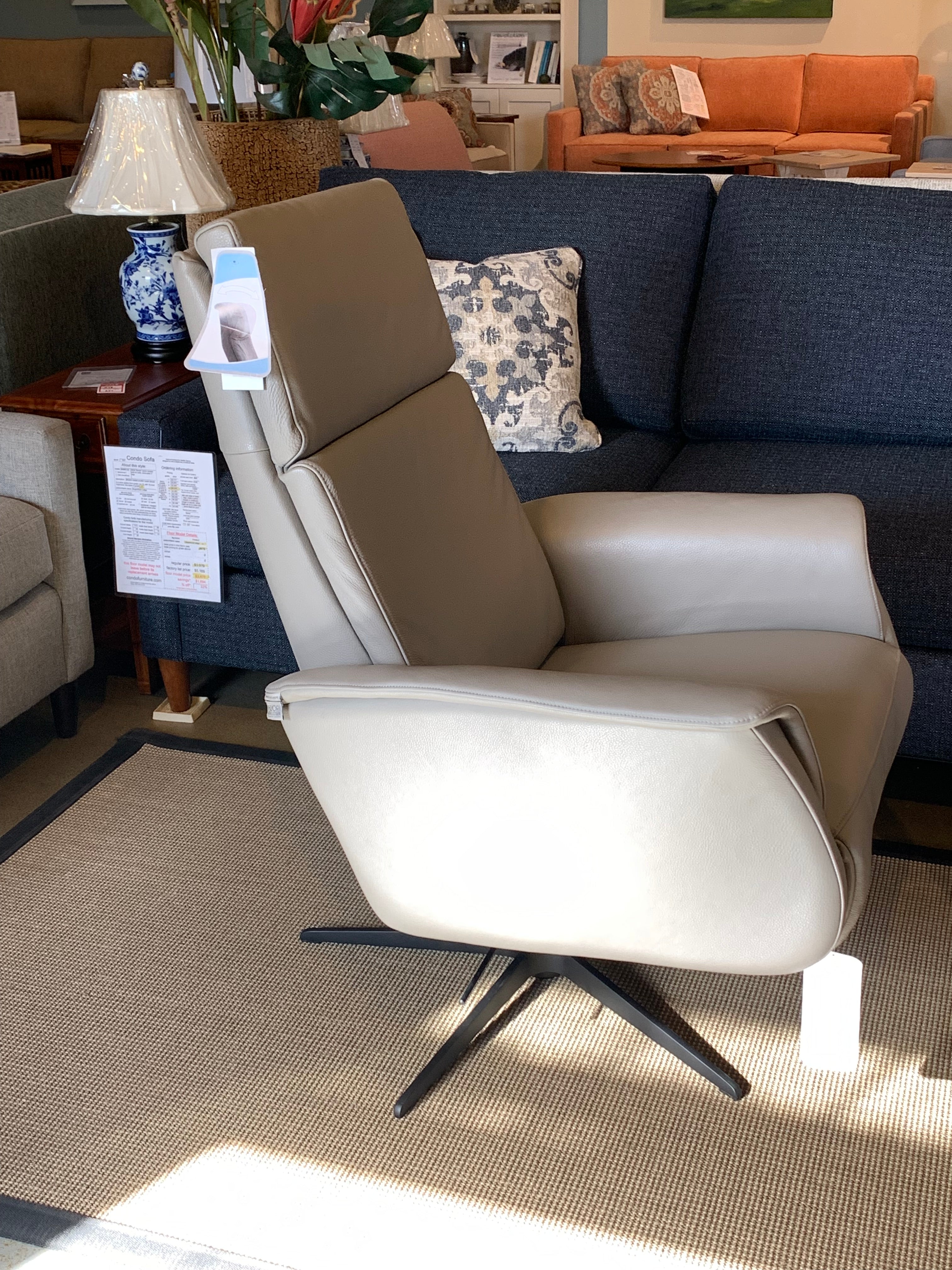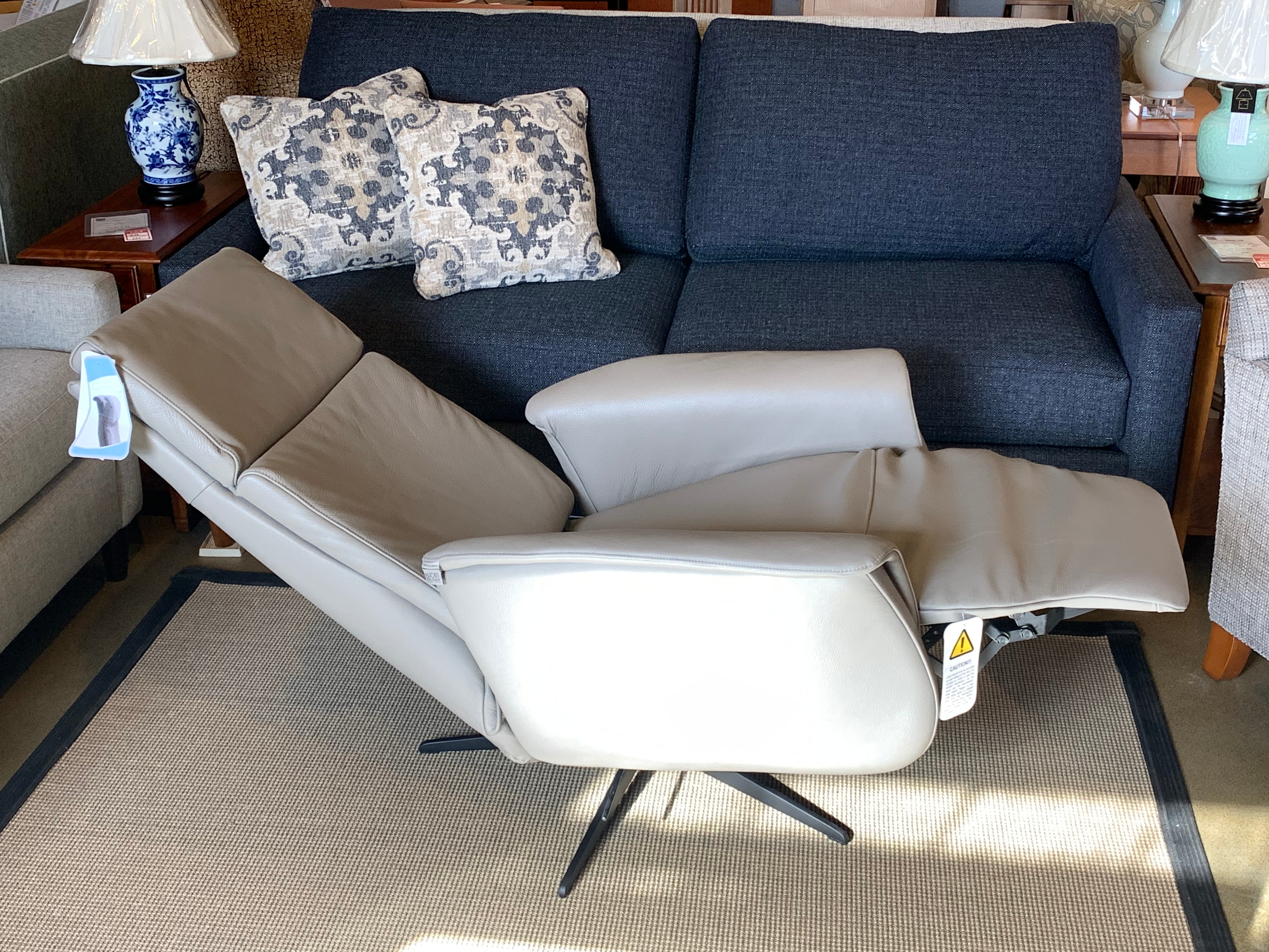 Danish designed Hjort Knudsen's Superior 8007 swivel recliner in light grey leather is shown on our floor with manual controls for the footrest, back and headrest. We are showing the large sized version of this chair without the optional gas lift mechanism on its base; using the gas lift changes the seat height for those who want better back support with feet on the floor. Also available with power controls (to order). These are stocked on the East coast in four colors of leather, either with manual or power controls, delivered to our store in around 2 weeks when in stock.
