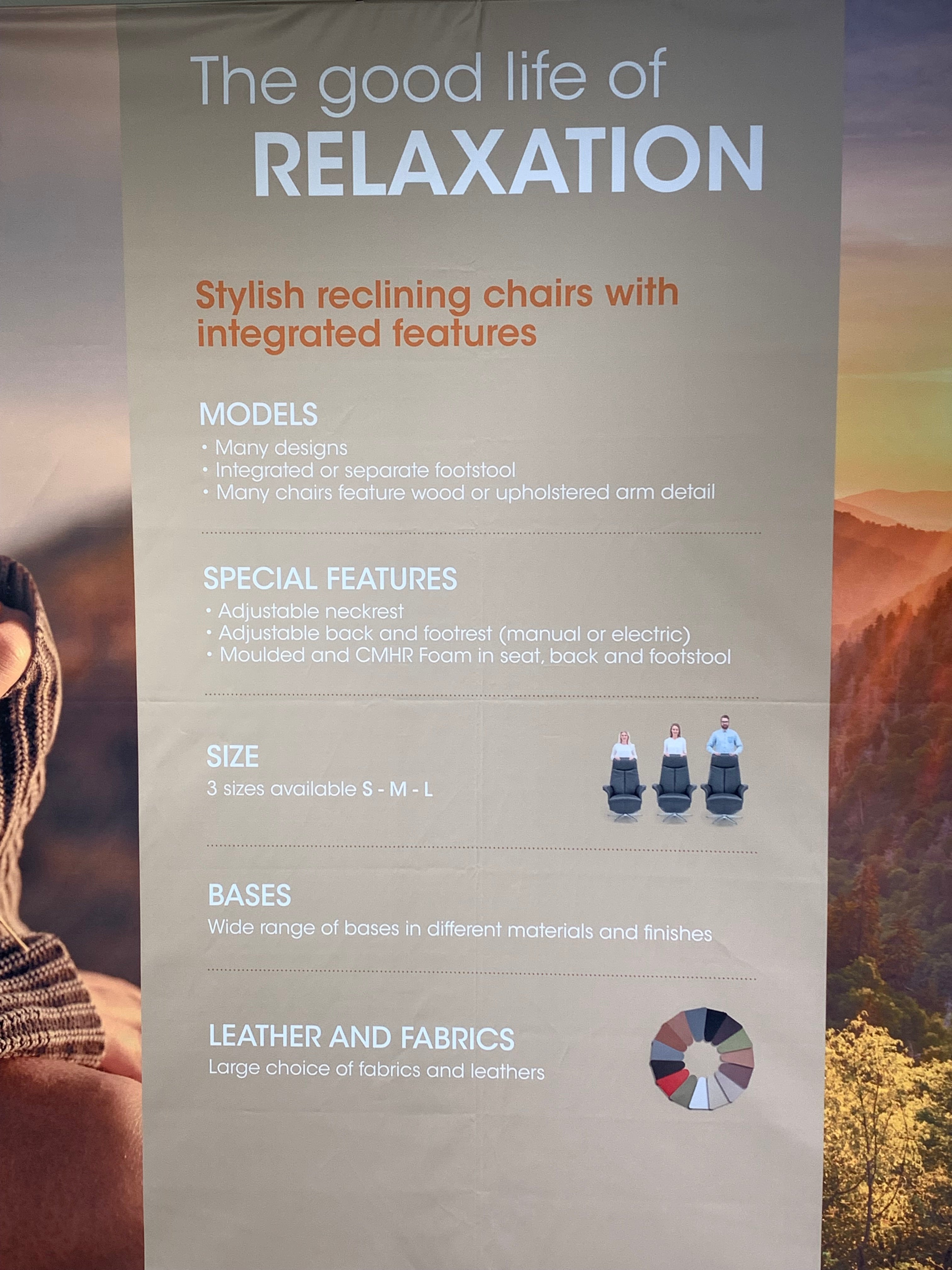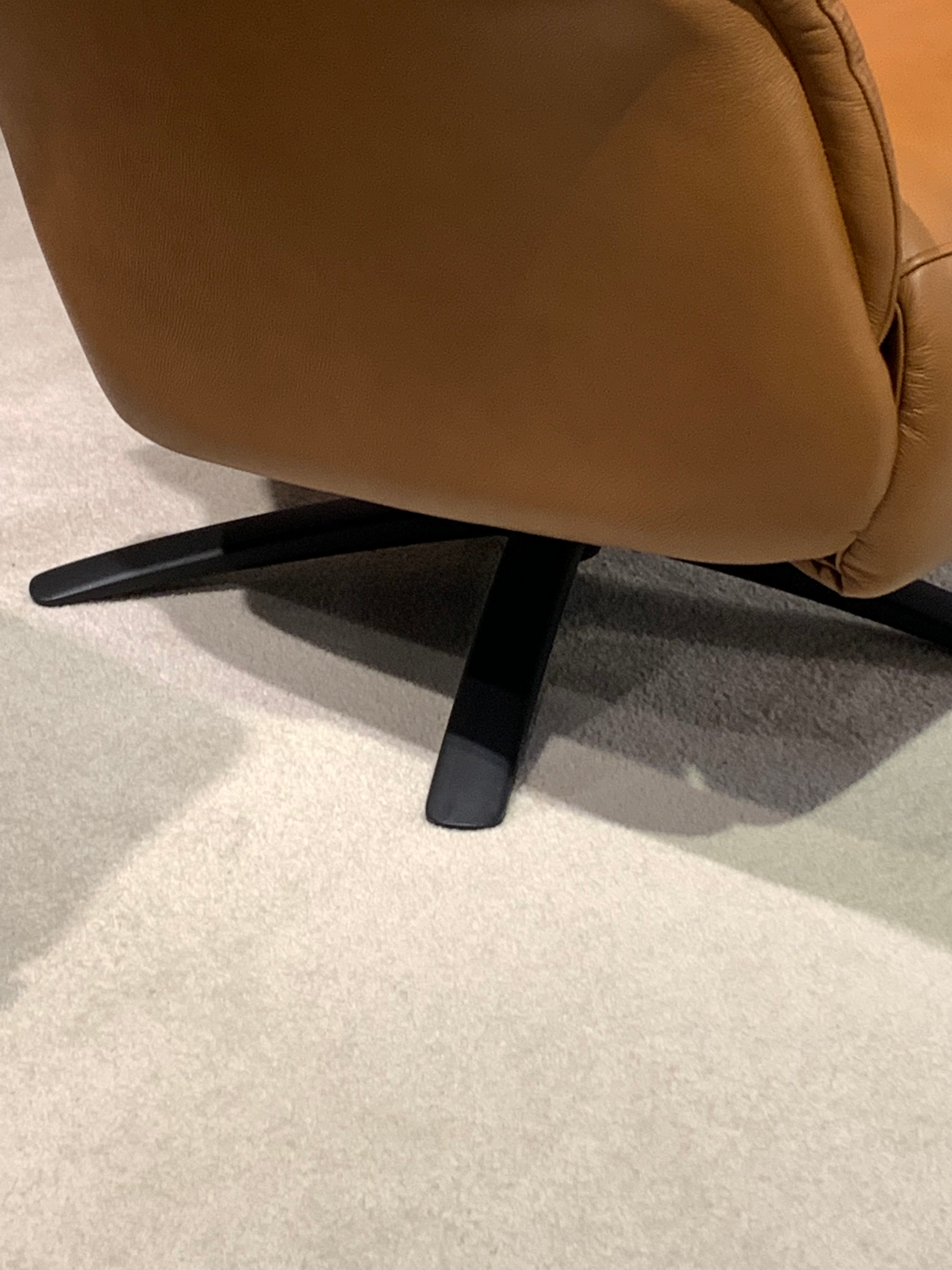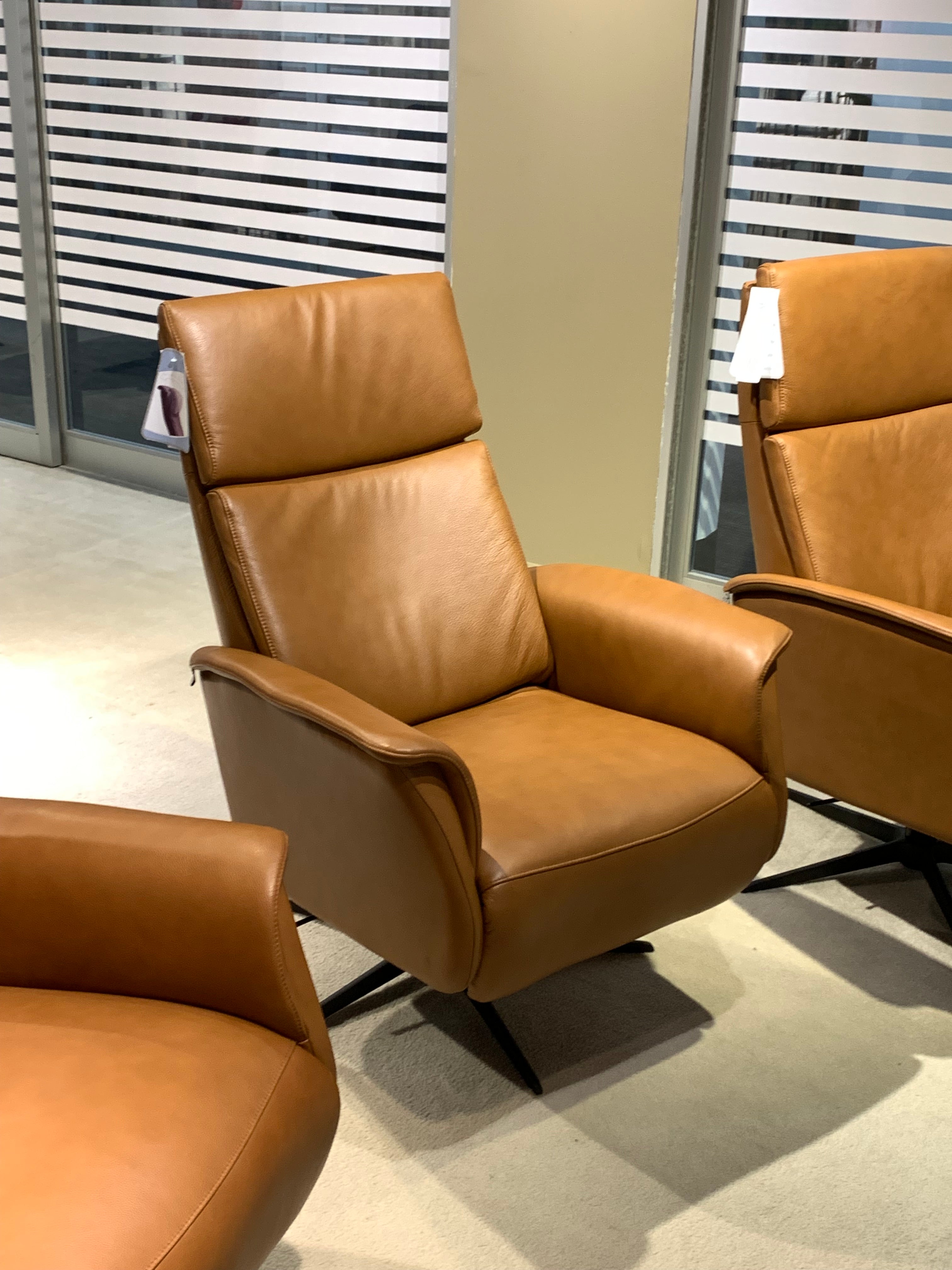 Danish designer Hjort Knudsen offers this excellent quality swivel recliner in two sizes: medium and large. It is one of the Superior models, also offered with electric motors for footrest, back and neck rest, or you may have the adjustable footrest, back and neck controls as well as a height-adjustable gas lift in manual mode for less. We will be showing a manual in medium size in the one color available for quick shipment, Cognac ,shown) as a floor model around May 5. The medium's gas lift base may be lowered for those who prefer a shorter seat height. These are stocked on the East coast in cognac leather, delivered to our store in around 2 weeks when in stock. Additional leathers, cloth covers, and options for other style bases are available for 16 week custom orders.