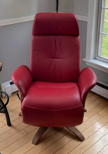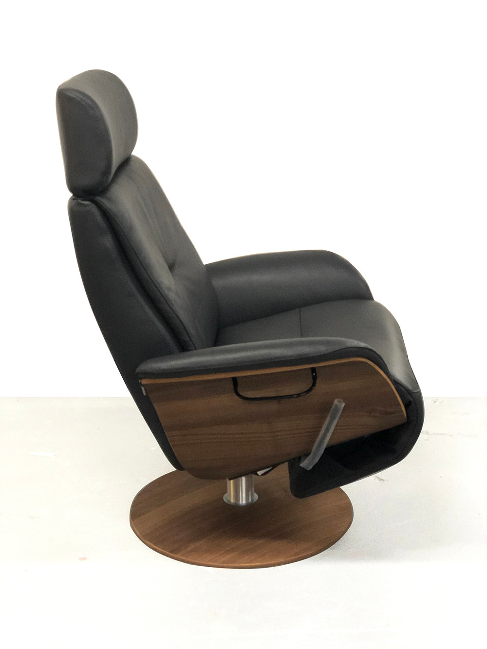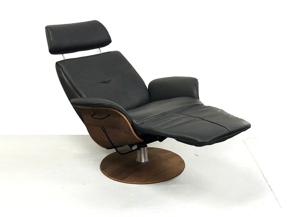 Danish designer Hjort Knudsen offers this excellent quality, zero balance swivel recliner. Balance is only available to order with electric motors for footrest and back with manual adjustable neck rest, or as we show it, in all-manual mode. These are no longer stocked on the East coast, but delivered to our store in around 16 weeks from order date.