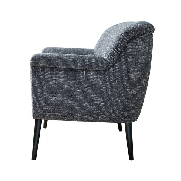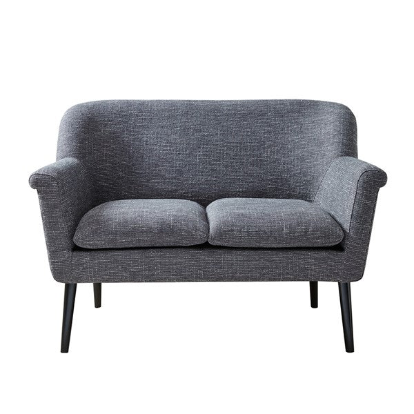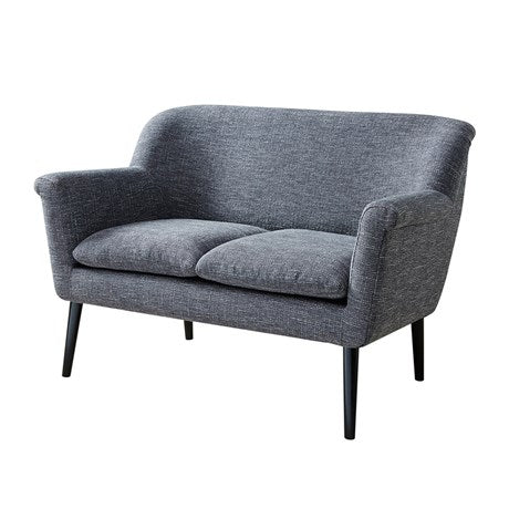 Southport Loveseat This 50" wide condo sized loveseat is shown in a natty bue-grey tweed, sporting removable flared mid-century modern legs. Attached seat cushions. Imported. Made without chemical flame retardants or added formaldehyde. Sits upright with good back support. Read our floor model sales policy here.